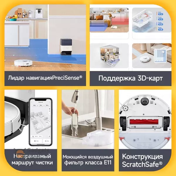 Особенности конструкции: акселерометр, датчик перепада высоты, индикатор заполнения пылесборника, лидар, мусоросборник в базе, мягкий бампер, станция самоочистки, датчик застрявшего колеса, датчик защиты от падения, датчик скорости вентилятора